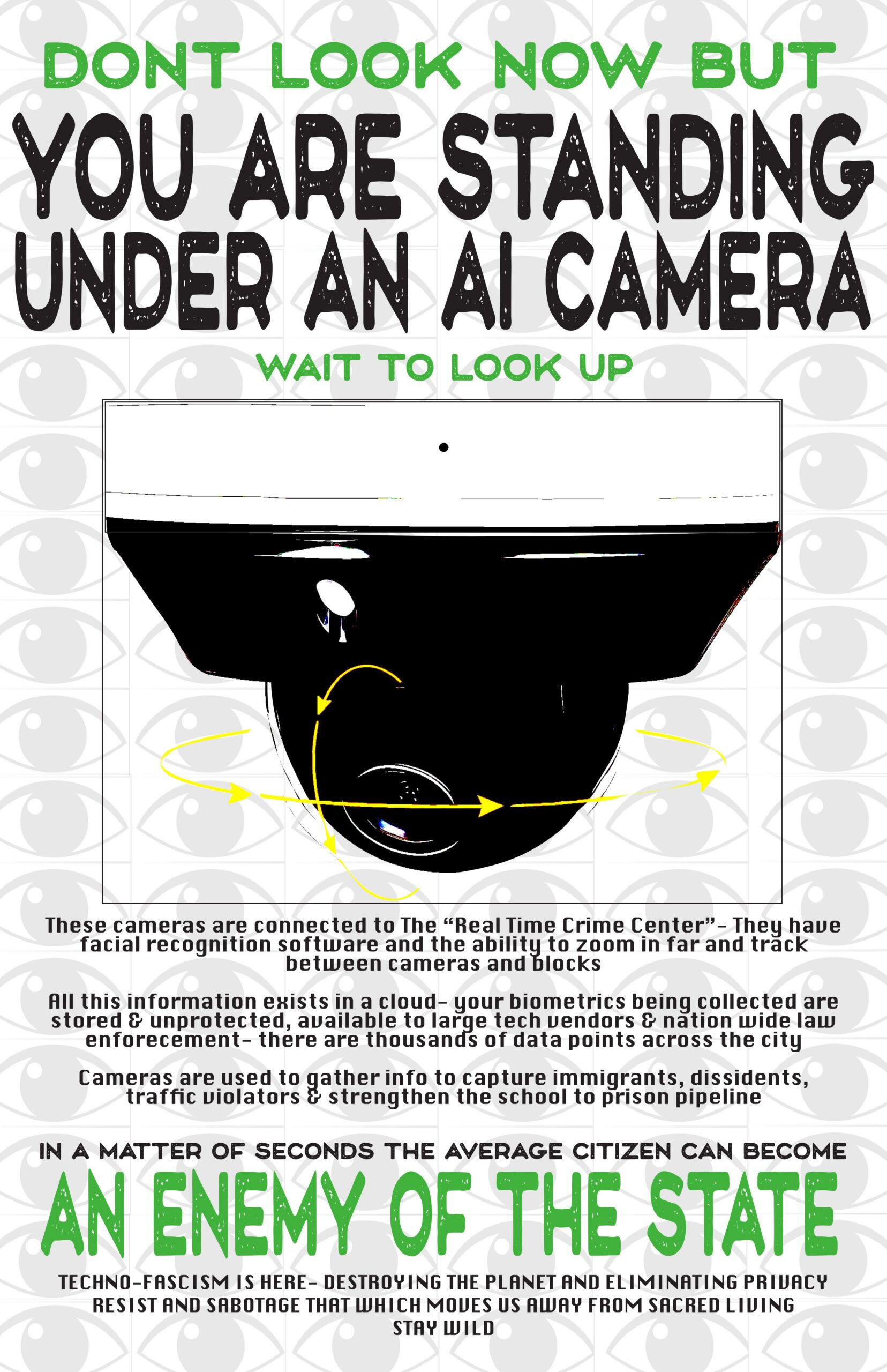 11×17" poster available for print out – Text reads "DONT LOOK NOW BUT/ YOU ARE STANDING UNDER AN AI CAMERA- Wait to Look Up/ These cameras are connected to the "Real Time Crime Center"- They have facial recognition software and the ability to zoom in far and track between cameras and blocks/ All this information exists in a cloud- your biometrics being collected are stored & unprotected, available to large tech vendors & nation wide law enforcement-there are thousands of data points across the city/ Cameras are used to gather info to capture immigrants, dissidents, traffic violators & strengthen the school to prison pipeline/ IN A MATTER OF SECONDS THE AVERAGE CITIZEN CAN BECOME AN ENEMY OF THE STATE/ Techno-fascism is here- Destroying the planet and eliminating privacy/Resist and Sabotage that which moves us away from sacred living/ Stay Wild"